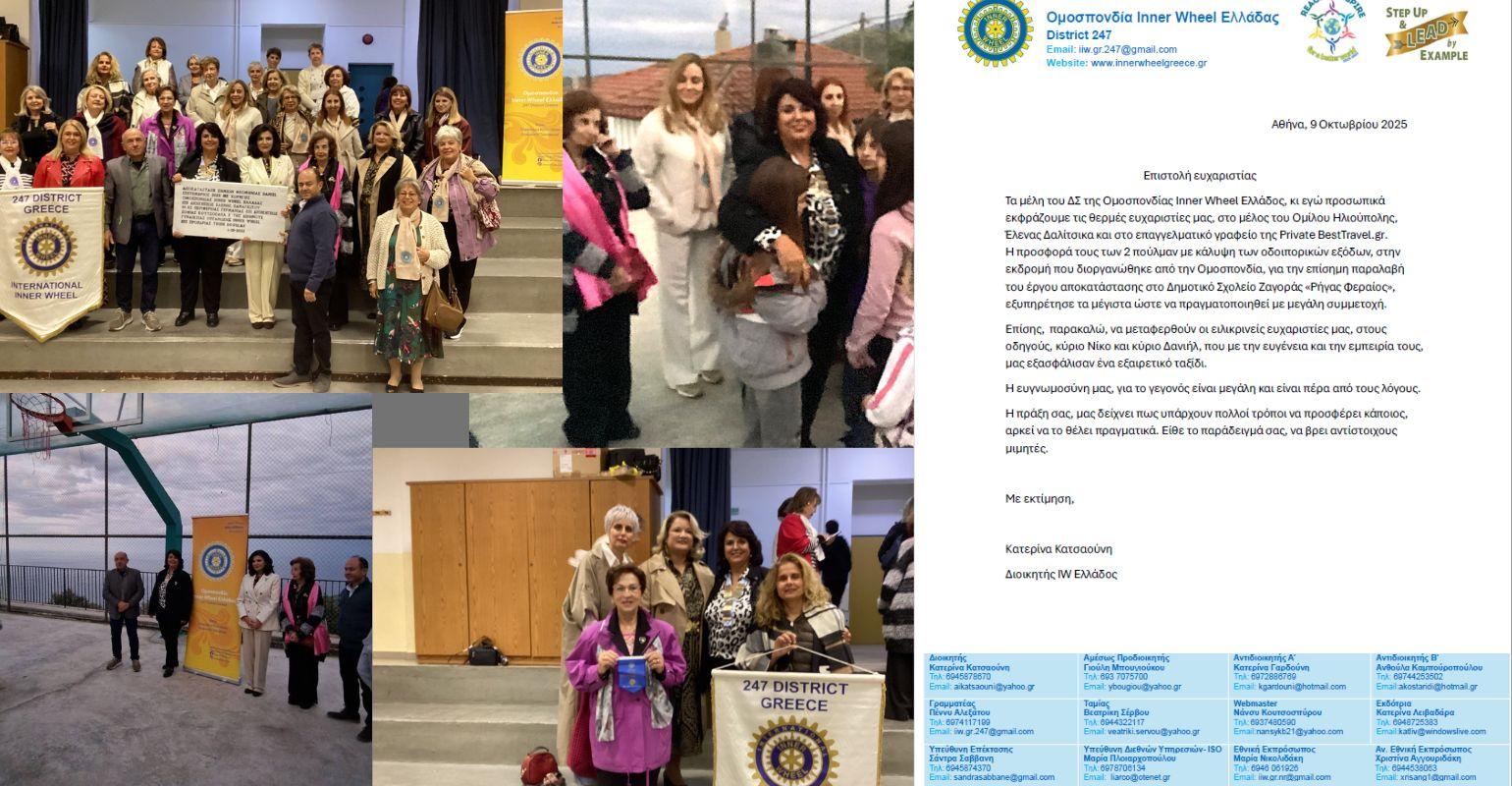 Το Σάββατο 4 Οκτωβρίου 2025, η Εταιρεία μας είχε την τιμή να στηρίξει την Ομοσπονδία Inner Wheel Ελλάδος, προσφέροντας τη δωρεάν μετακίνηση των συμμετεχόντων στην εκδρομή για την Επίσημη Παραλαβή του Έργου Αποκατάστασης του Δημοτικού Σχολείου Ζαγοράς «Ρήγας Φεραίος».